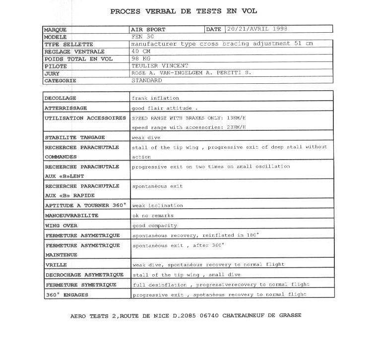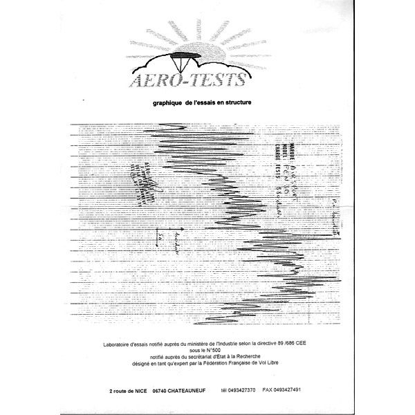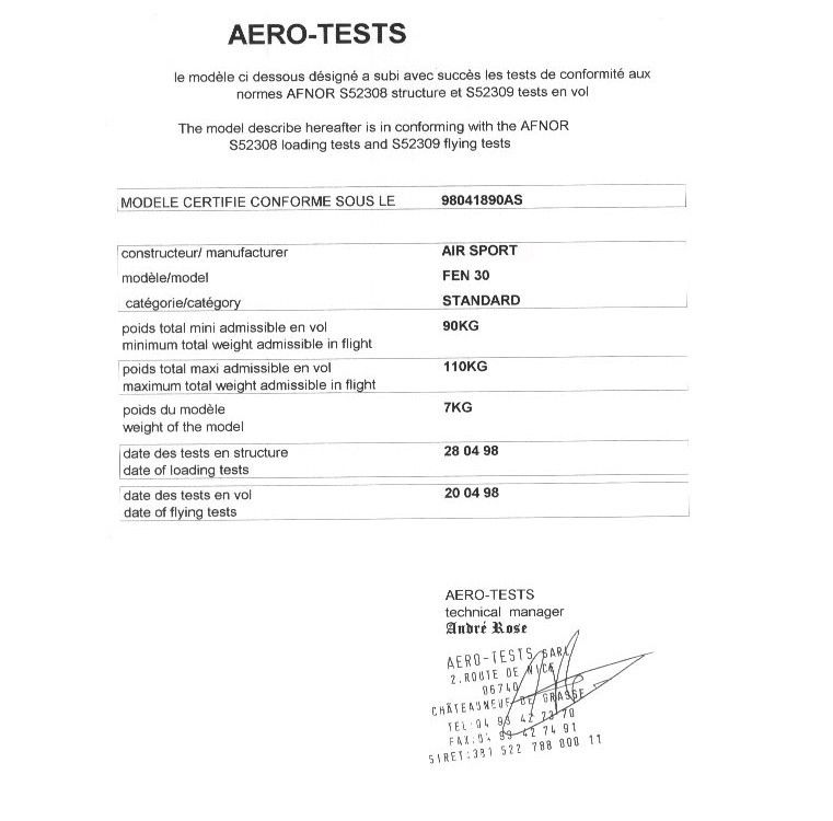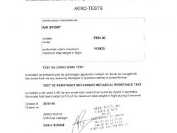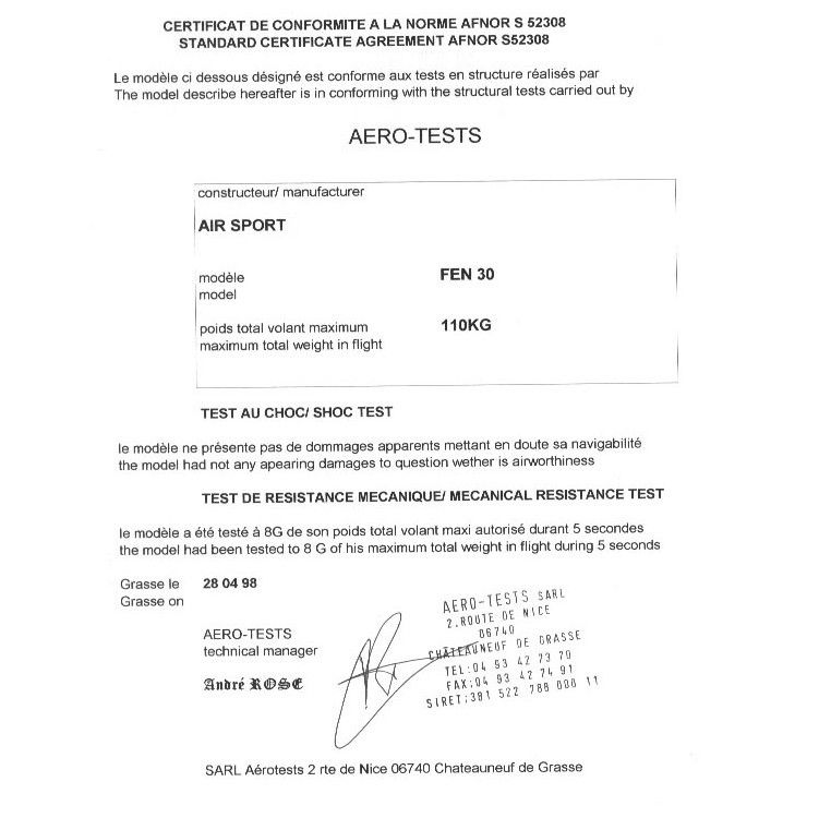 Paralotnia Fen posiada francuski certyfikat AFNOR Standard wykonany przez firmę AERO-Tests z Nicei.